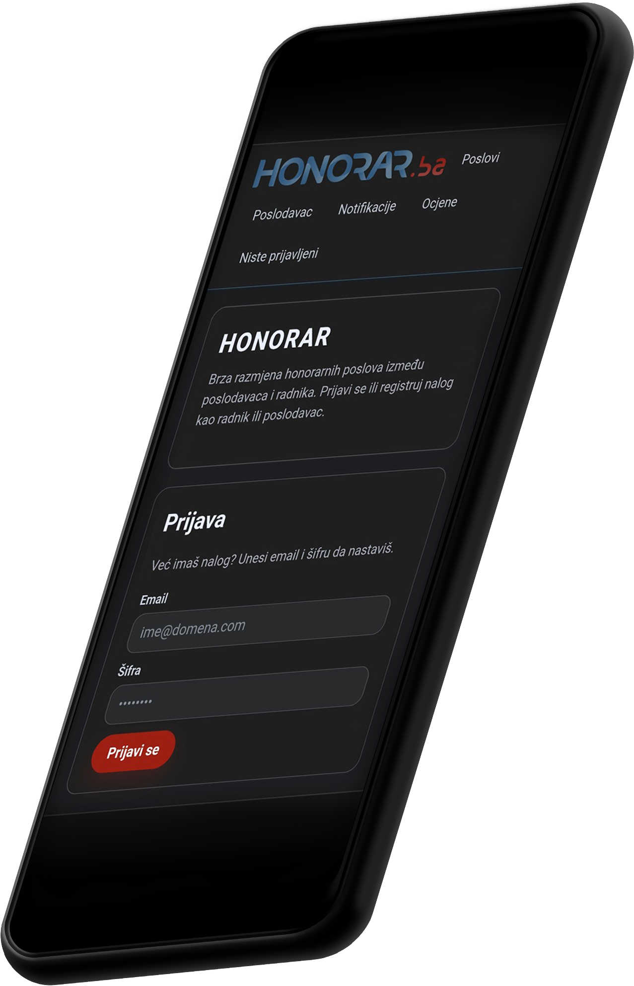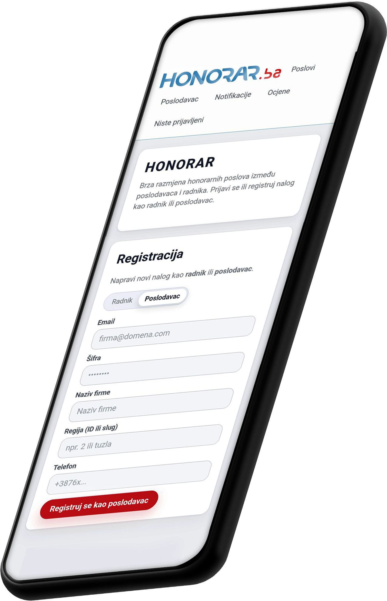 HONORAR.ba je digitalna platforma koja povezuje poslodavce i radnike za kratkoročne i honorarne poslove. Kroz aplikaciju, poslodavci mogu brzo i jednostavno objaviti oglase za mini poslove kao što su konobarisanje, dostava, pomoć u kući ili promocije. S druge strane, radnici mogu pretraživati dostupne poslove u svom gradu i aplicirati direktno putem aplikacije. Cilj je omogućiti brzo zapošljavanje i dodatnu zaradu – bez komplikacija.